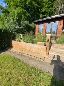 We recommended composite decking for its weather resistance, splinter-free surface, and contemporary finish. To complement the garden’s overall layout, we built the decking area at an elevated height and installed decking stepsusing matching composite boards and sturdy timber framing.