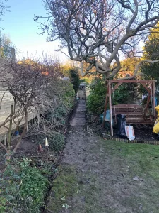 The completed garden is a striking yet serene outdoor retreat that beautifully balances form and function. The natural stone patio provides a durable and elegant foundation for outdoor gatherings, while the tiered steps offer effortless movement across the sloped landscape. The oak planters and reclaimed railway sleepers frame the space with rustic charm, bringing in texture and depth. The batten fence adds a contemporary edge, enhancing privacy without overwhelming the design. Altogether, the space now feels cohesive, inviting, and tailored to the client’s lifestyle , a transformation that has turned a previously underused garden into a standout feature of the home.