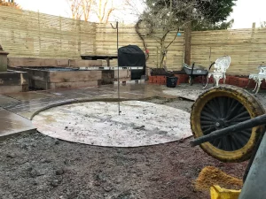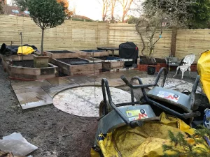 Indian Sandstone Patio in Circles and Railway Sleepers