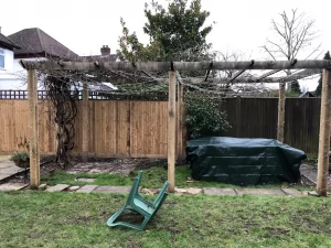The pergola frame was erected using deep-set posts and reinforced fixings. Crossbeams and rafters were cut to measure, aligned precisely, and treated for long-term protection against weather damage.