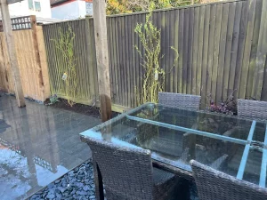 The finished garden now features a striking slate patio, a vibrant lawn, and a beautifully constructed pergola that ties the entire design together. The space feels open, modern, and highly functional—perfect for hosting, relaxing, or enjoying time outdoors. The blend of natural tones and strong craftsmanship ensures the garden will remain attractive and durable for years to come.
