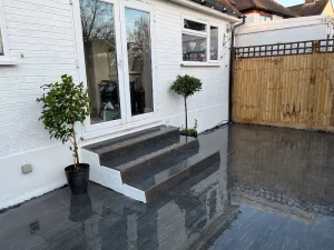 We excavated the patio area and installed a solid Type 1 sub-base, followed by a sharp-sand bed to support the slate slabs. Each piece was hand-cut where required and laid with minimal joint lines for a premium finish. The patio was pointed cleanly to ensure durability and water resistance.