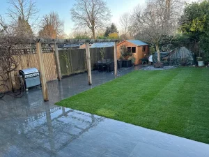 Gardens Design and Build Ltd delivered a full garden transformation combining a stylish slate patio, premium turf installation, and a custom-built wooden pergola. This project blends natural textures with modern design to create a vibrant, functional outdoor space perfect for relaxation, dining, and family use. The combination of hard landscaping and soft greenery results in a balanced, contemporary garden that feels both refreshing and welcoming.
